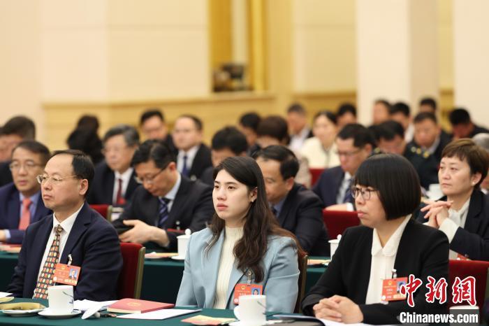 3月7日,十四届寰宇东说念主大三次会议江苏代表团举行绽开团组会议。图为寰宇东说念主大代表、江苏省游水队队长张雨霏(中)参会。中新社记者 盛佳鹏 摄