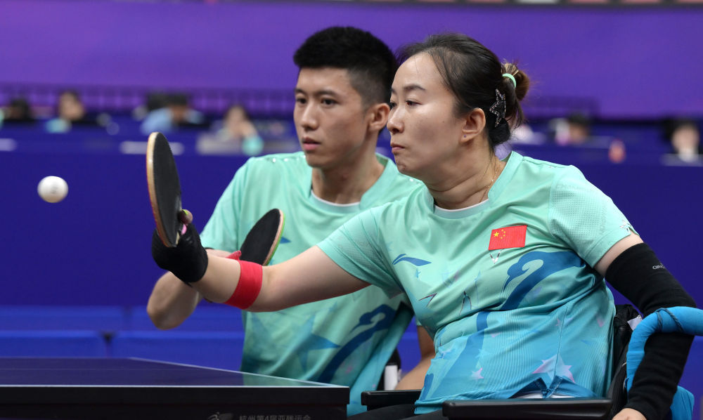 图为2023年10月26日,毛淋(前)和队友翟翔在杭州第4届亚残运会乒乓球搀杂双打4级B组的比赛中。新华社记者 李贺 摄