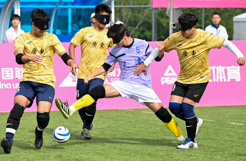 12月14日,在广州举行的世界第十二届残疾东说念主默契会暨第九届稀奇奥林匹克默契会盲东说念主足球样貌须眉组小组赛中,天津队1:0校服广东二团队。图为天津队球员范海林(右二)在比赛中打破。新华社记者 陈浩明 摄
