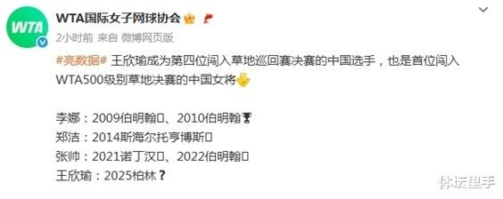 WTA官方实时给出了历史统计数据:王欣瑜成为第四位闯入草地巡回赛决赛的中国选手,亦然首位闯入WTA500级别草地决赛的中国女将。此前,李娜在2009、2010讨论两年闯进过WTA250伯明翰草地赛决赛,郑洁在2014年参预了WTA250斯海尔托亨博斯站的草地决赛,张帅则是差别在2021年的诺丁汉、2022年的伯明翰两次闯入250级别草地赛决赛。